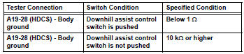 When the downhill assist control switch is pushed on, the downhill assist control function is available and the downhill assist control indicator light illuminates.